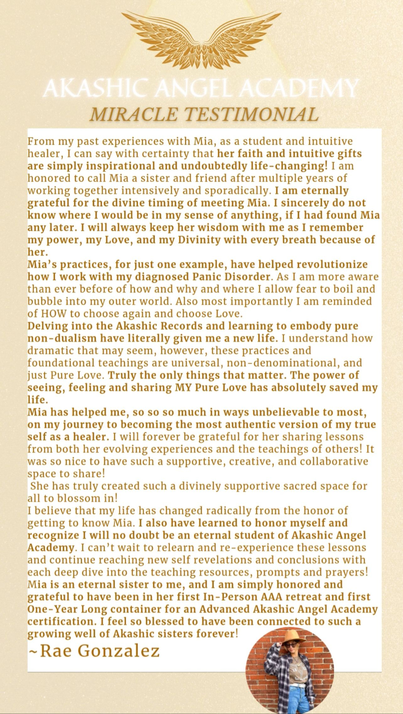 This year with Mia has been the most transformative time of my life. I have experienced many deaths and have been born anew. The utmost gratitude to Mia for being such a beautiful channel for the Holy Spirit to work miracles through. And for creating and holding a safe sacred place for healing to take place. Being in this container with Mia has been an absolute blessing and so much more than I ever could have imagined. Thank you sister for shining your light so bright, I love you eternally. 🤍🤍🤍