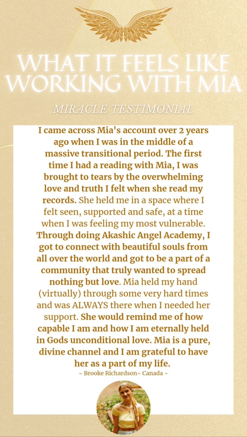 This year with Mia has been the most transformative time of my life. I have experienced many deaths and have been born anew. The utmost gratitude to Mia for being such a beautiful channel for the Holy Spirit to work miracles through. And for creating and holding a safe sacred place for healing to take place. Being in this container with Mia has been an absolute blessing and so much more than I ever could have imagined. Thank you sister for shining your light so bright, I love you eternally. 🤍🤍🤍